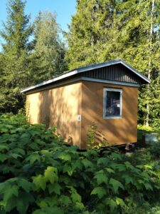 Pihassa aitta, puuvarasto, autokatos ja kasvihuone.